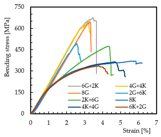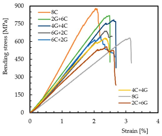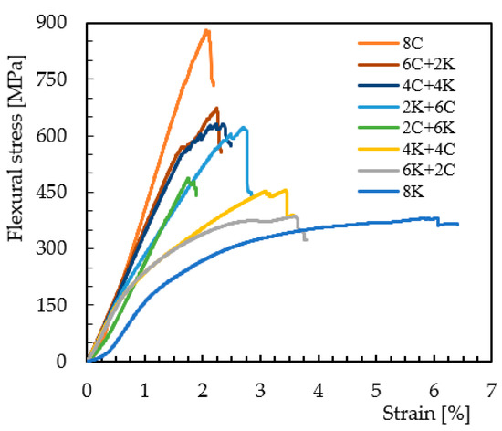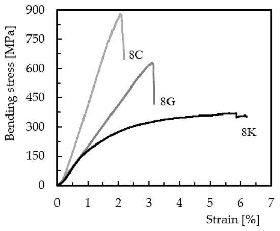 Static bending tests were performed to obtain the hybridization effect on the bending properties. However, to understand the behavior of each fiber in the bending performance, Figure 1 shows typical bending stress/strain curves for non-hybrid configurations (8G, 8K, and 8C), which are representative of all obtained for each configuration analyzed.