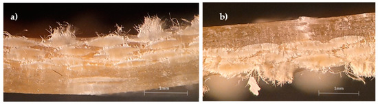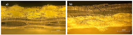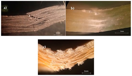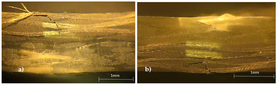For the different configurations analyzed, Figure 2 shows the main damage mechanisms observed. Regarding the carbon/epoxy composite, Figure 2a evidences fiber fracture in the compression side with quite small delaminations around the broken fibers, which is in good agreement with the open literature [10,29,30,31,32,33]. According to Reis et al. [32], the high compressive stress concentration in the pin load contact region associated with the low compressive strength of the fibers favors the fiber breakage in this region. In terms of the glass/epoxy composite, Figure 2b shows the damage mechanisms observed for this configuration. This laminate, in addition to having higher flexural capacity compared to the carbon laminate, shows that the main damage mechanism occurs with the rupture of the tensile fibers, although some delaminations appear in the pin load contact region due to the stress concentrations that were mentioned earlier (and conveniently reported in [32]). Finally, for the Kevlar/epoxy composite, Figure 2c shows the failure mechanisms, where the large delaminations observed are responsible by the bending strength loss. This failure mode agrees with the study developed by Ferreira et al. [25].