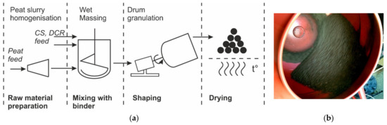 Using the wet granulation method, nineteen granule compositions were prepared. The composition of the granular composites before drying is shown in Table 2 and Table 3. They are designated CR-HP-CS, where CR is a percentage by the mass of devulcanised rubber, HP is a percentage by the mass of homogenised peat (including water), and CS is a percentage by the mass of cenospheres. The composition changes significantly after drying due to the evaporation of water from the absorbent. The composition after drying is also presented in Table 2 and Table 3 but for convenience, the initial compositions’ (including water from HP) designations are used. The detailed granules production method has been published in a previous work [4]. The production scheme for granular adsorbents and the used drum granulator are represented in Figure 1a,b respectively.