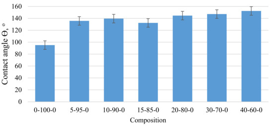 As can be seen from Figure 3, with an increase in the mass fraction of CR in the composite material, the contact angle with water also significantly increases, which indicates that the addition of CR increases the hydrophobicity of the samples. Thus, replacing 5 wt.% peat with CR can show a 42% increase in contact angle. As the amount of CR in the composite increases, the contact angle tends to increase. The most significant contact angle (Θ) 152° was observed for sample 40-60-0. In this case, the sample was barely wetted by water and the drops tended to drain off the surface. The hydrophobicity of the surface of the samples should facilitate better absorption of oil products.