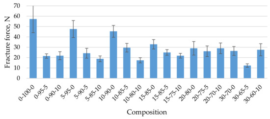 The strength of the composite granules was determined using a KAHL mechanical strength tester (Amandus Kahl GmbH & Co. KG, Reinbek, Deutschland). The principle of operation of the device is to fix the force required to compress the granule. The compression of the granules took place at a compression speed of 0.5 mm·min−1. For the study of each composition, 30–40 granules with similar geometry and dimensions of 6.0 ± 0.5 mm were tested.