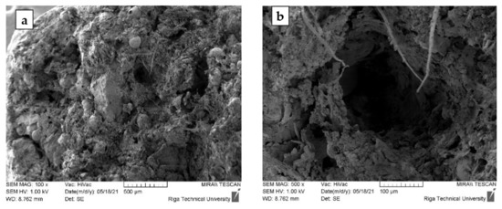By analysing the SEM images of the samples (Figure 4), it can be concluded that, similarly to the compositions containing CR, in the compositions containing CR and CS, their destruction by compression occurs at the interface between the homogenised peat and the aggregates. In addition, the introduction of CS into the system increases the proportion of structural defects and voids.
