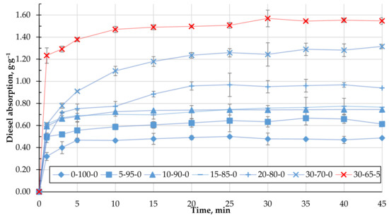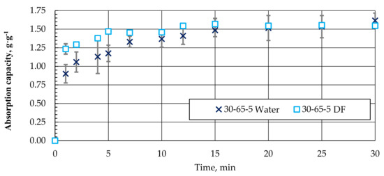 When using granules to collect oil products from the water surface, they must absorb water to a minimum. As the surface hydrophobicity increased, the ability of the samples to absorb water was expected to decrease. However, as the experiment has shown, pellets with different compositions absorb practically as much water as the g·g−1 of DF. A comparative example of water and DF absorption kinetics for granules with a composition of 30-65-5 is shown in Figure 14.