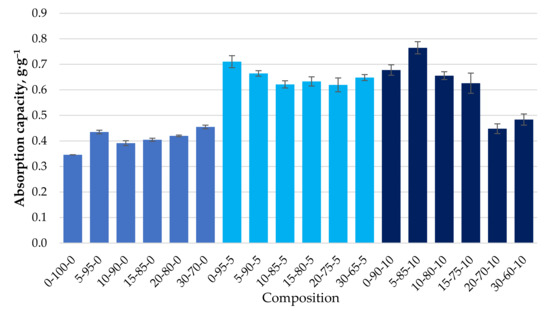 Absorption capacity (g·g−1) of DF depending on the composition of the composite.