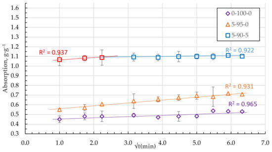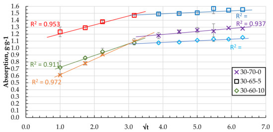 As shown in Figure 12, the absorption relationships of granules from pure, homogenised peat and DF with a small amount of CR (composition 0-100-0 and 5-95-0) in qt − t0.5 coordinates are practically liberal. It is believed that the diffusion of a substance into the sorbent pores or internal diffusion is a limiting step in the rate of the adsorption process if the relation qt = f (t0.5) is linear and crosses the origin of the coordinate (C = 0). In cases where the constant C is not zero, the rate of adsorption is significantly influenced by the absorption of the sorbate to the surface of the granules and the diffusion through the boundary layer [25,26].