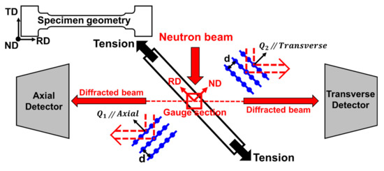 In situ neutron diffraction experiments were conducted under monotonic tensile loading with a strain rate of using the TAKUMI diffractometer in the Materials and Life Science Experimental Facility (MLF) of the Japan Proton Accelerator Research Complex (J-PARC, Tokai-mura, Ibaraki, Japan) [30]. Figure 2 is a schematic of time-of-flight (TOF) in situ neutron diffraction geometry at the spallation neutron source. The specimen was positioned at 45° and two detectors (axial and transverse) were located at 90° from the incident neutron beam. Since the neutron diffraction data was collected by the two detector banks, the entire diffraction patterns, whose scattering vectors were parallel (axial detector) and perpendicular (transverse detector) to the tensile loading direction (shown in Figure 2), were acquired under in situ tensile loading. From this, we received information on lattice strains for various crystallographic orientations. We gathered information on texture from relative intensity variations, and on the microstructural changes during plastic deformation from diffraction peak profile analysis.