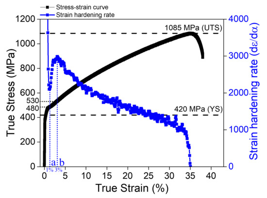 Figure 3 shows the stress–strain response of the (CoNi)74.66Cr17Fe8C0.34 HEA. The non-equiatomic (CoNi)74.66Cr17Fe8C0.34 exhibited a relatively higher ultimate tensile strength (UTS) and moderate ductility compared to the equiatomic CoNiCrFe and single-phase non-equiatomic FCC HEAs [36]. The UTS and ductility of (CoNi)74.66Cr17Fe8C0.34 were 771 MPa and 46%, respectively, in the engineering stress–strain curve. The strain hardening rate (SHR) of (CoNi)74.66Cr17Fe8C0.34 (the blue square in Figure 3) showed unusual behavior at the very early stage of deformation, such that the SHR suddenly dropped down to the strain of 1% (corresponding to 480 MPa) and then abruptly increased up to the strain of 3% (corresponding to 530 MPa), after which the SHR gradually decreased until fracture.