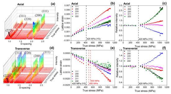 In situ neutron diffraction experiment results: the evolution of (a) sequential diffraction patterns, (b) lattice strains, (c) diffraction peak intensities during tensile loading in the axial direction, (d) sequential diffraction patterns, (e) lattice strains and (f) diffraction peak intensities during tensile loading in the transverse direction.