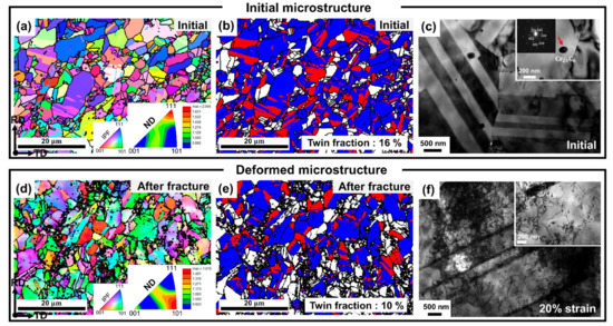 The microstructures measured from EBSD and TEM: (a–c) are the initial microstructure, (d–e) are the microstructure after fracture and (f) is the microstructure at 20% strain.