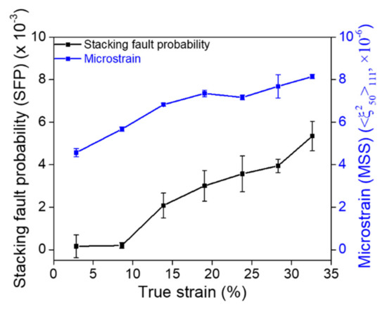 Development of stacking fault probability (black color) and microstrain (blue color) as a function of true strain during the tensile test.