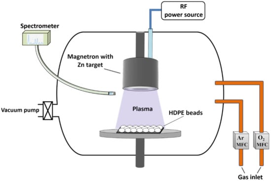 Deposition of ZnO films on the surface of HDPE beads (obtained from GoodFellow, Huntingdon, UK) with and without Ni underlayer was performed by reactive magnetron sputtering technique in a custom modified physical vapour deposition system (PVD-75, Kurt J. Lesker Company, Jefferson Hills, PA, USA) (Figure 1). Prior to the ZnO deposition, the HDPE beads were precovered with a thin layer of Ni (thickness of about 100 nm) using magnetron with Ni target (purity 99.99%, Kurt J. Lesker Company, Clairton, PA, USA) powered by a direct current power source. Our previous study disclosed that metallic underlayers can have positive impacts on the bactericidal effect of the photocatalyst under visible-light irradiation [28]. During the process, HDPE beads were placed under the unbalanced magnetron with a circular Zn target (99.99% purity and 76 mm diameter, Kurt J. Lesker Company, Clairton, PA, USA) which was powered by an RF power source working at 150 W for 1 h. After that, the HDPE beads were flipped over, and ZnO film was deposited on the other side of the beads under the same conditions. The distance between the HDPE beads and Zn target was 7 cm. The ZnO film was deposited at a fixed pressure of 1 × 10−2 mbar which was preselected experimentally as an optimal one according to our previous study [51]. Ar and O2 gas mass flow controllers (MFC) were connected to the Process Control and Plasma Emission Monitoring System (Flotron X, Nova Fabrica Ltd., Ignalina, Lithuania) which ensured a constant pressure and an accurate Ar and O2 gas flow ratio (4:1) according to the changes of Zn emission intensity. In order to measure the thickness of ZnO film, the film was deposited on the flat quartz substrate under similar reactive magnetron sputtering conditions. The approximate thickness of ZnO film measured by stylus profilometer (Ambios XP-200, Ambios Technology, Santa Cruz, CA, USA) was 4–5 µm.