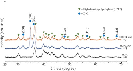 Phase structure of primary HDPE beads and ZnO deposited on the HDPE beads without and with Ni underlayer was examined by X-ray diffraction technique (Figure 2). XRD pattern of primary HDPE beads is presented in Figure 2a. The size of beads used in this study was 2–4 mm. The XRD data were collected from the surface of HDPE beads which is exceptionally rough for XRD and, unlike the flat sample, causes the broadening in the peaks. However, all of the peaks matched the structure of the high-density polyethylene ((C2H4)n) which corresponds to the standard JCPDS card number 00-060-0984. Any other crystalline impurities were not detected.