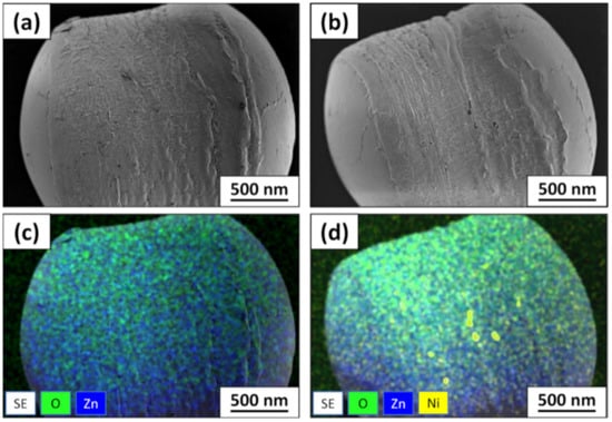 The elemental mapping confirmed the relatively uniform distribution of Zn and O elements across the HDPE beads surface in both cases. Figure 3d represents photocatalyst with Ni underlayer, while only a few Ni clusters can be observed. This is related to the ZnO film thickness, which is about 4–5 µm and technological limitations of EDS determine that Ni can be seen only in the areas with thinner ZnO film, its absence or cracks. In general, the surface morphology and elemental mapping analysis showed that Ni underlayer does not have a significant influence on ZnO film surface characteristics deposited on HDPE beads.