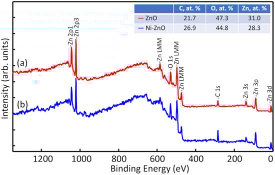 Elemental surface analysis of ZnO film deposited on the HDPE beads without and with Ni underlayer is presented in Figure 4. In both cases, the detected elements were carbon (C), oxygen (O), and zinc (Zn), without any unwanted impurities. Quantification of these elements demonstrated similar results for both samples (inserted table in Figure 4). Such an amount of carbon is observed due to exposure of samples to the ambient air. After ZnO film deposition, samples were taken out from the vacuum chamber and handled in the air which caused the formation of a thin adventitious carbon/hydrocarbon (and/or hydroxyl species) layer [62]. The Ni underlayer is immobilised under a thick layer of ZnO. Therefore, the XPS did not detect any peaks of Ni since it is a surface-sensitive measurement technique.