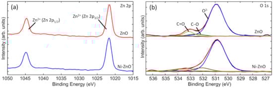 The surface chemical bond analysis of the ZnO film deposited on the HDPE beads without and with Ni underlayer was performed by high-resolution XPS scans for Zn 2p and O 1s regions (Figure 5a,b, respectively). However, the Ni underlayer did not affect the chemical structure (oxidation state) of the surface because both samples showed nearly identical spectra. Zn 2p spectrum consisted of two main components of Zn 2p3/2 and Zn 2p1/2 positioned at 1021.8 and 1044.9 eV, respectively (Figure 5a). According to other studies, these binding energies and separation of 23.1 eV between two peaks represent the Zn2+ ions of ZnO lattice (Zn–O bonds) [63,64,65]. The O 1s electron spectrum was deconvoluted into 3 peaks (Figure 5b). The major one at about 530.8 eV was assigned to the O2- oxidation state which also confirmed the formation of Zn–O bonds in the wurtzite structure. The shoulder peaks (at the higher energies) can be attributed to the oxygen atoms in C–O, C=O bonds, or even hydroxyl groups, due to surface contamination by species and moisture existing in the air [66].