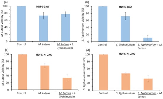 Photocatalytic inactivation of separate M. Luteus and S. Typhimurium bacteria and their mixture under visible-light irradiation for 2.5 h: (a) viability of M. Luteus alone and in the mixture with S. Typhimurium using ZnO film deposited on the HDPE beads without Ni underlayer; (b) viability of S. Typhimurium alone and in the mixture with M. Luteus using ZnO film deposited on the HDPE beads without Ni underlayer; (c) viability of M. Luteus alone and in the mixture with S. Typhimurium using ZnO film deposited on the HDPE beads with Ni underlayer; (d) viability of S. Typhimurium alone and in the mixture with M. Luteus using ZnO film deposited on the HDPE beads with Ni underlayer. The length of the error bars is the standard deviation of each measurement.
