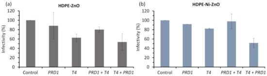 ZnO photocatalyst alone (in the dark) did not affect or lower the infectivity of bacteriophages. On the other hand, the blank test of visible light irradiation on bacteriophages without the photocatalyst showed that the infectivity decreased by about 2–7%. Results showed that bacteriophages seem more resistant to light than bacteria. ZnO-coated HDPE beads without Ni underlayer reduced the infectivity of PRD1 phage by 12%, while in the case of mixture with T4, by 20% after irradiation under visible light (Figure 7a). Moreover, the infectivity of T4 decreased by 38% and 47% after irradiation of T4 alone and in the mixture with PRD1, respectively. To summarise, this investigation demonstrated that visible-light-activated ZnO photocatalyst (without Ni) had a more noticeable effect on the bacteriophage mixtures than on bacteriophages alone.