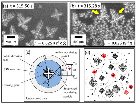 Murphy et al. studied the buoyancy effect on the number density of -Al dendrite formation events in TiB-inoculated Al-Cu alloys using laboratory-based radiography apparatus, which allowed for both vertical and horizontal solidification arrangements [64]. For the same cooling rate and at the same time instant during near-isothermal cooling, horizontal solidification (Figure 2a), which removed the gravity effect from the imaging field of view, led to a coarser -Al grain size and a much smaller grain number density than vertical solidification (Figure 2b). Compared with horizontal solidification where all the grains remained static after formation (Figure 2a), almost all the grains in vertical solidification were mobile and floated upwards as a result of buoyancy (due to the lower density of solid -Al grains than the surrounding Cu-rich liquid), with only two grains remaining static (indicated by the yellow arrows in Figure 2b), possibly due to nucleation on oxides on the sample wall. The buoyancy-induced grain motion in the vertical arrangement led to early physical impingement between newly formed gains, restricted grain growth, and facilitated further nucleation events. Further, when solidified horizontally, a distinct “nucleation separation distance” could be easily noticed (Figure 2a), within which no further nucleation event was observed, and this distance was inversely proportional to the cooling rate [64].