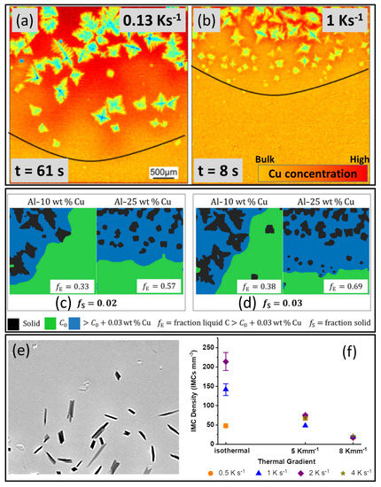 False-coloured radiographs of solidifying Al-15wt%Cu inoculated with TiB at (a) 0.13 K s and (b) 1 K s [12]. Contour maps showing the fraction of Cu-rich liquid (, coloured in blue) at a solid fraction of (c) and (d) during solidification of Al-10wt%Cu and Al-25wt%Cu. The Cu-rich liquid was defined as liquid with a Cu concentration 0.03 wt% higher than the bulk concentration [10]. (e) A radiograph of primary AlFe crystals in a solidifying Al-3wt%Fe alloy at 0.5 K s and 5 K mm [15]. (f) Final AlFe number density as a function of thermal gradient in Al-3wt%Fe [15].