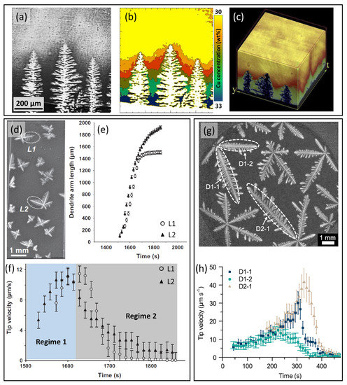 (a) A radiograph of growing columnar -Al dendrites in an Al-30wt%Cu alloy solidifying at 0.6 K s [92]. (b) The corresponding Cu-concentration contour map [92]. (c) Time-resolved Cu-concentration contours stacked into a 3D volume, with time being the third dimension [92]. (d) A radiograph of equiaxed -Al dendrites growing in an Al-10wt%Cu alloy at 0.008 K s [17]. (e) Length evolution of dendritic arms and (as denoted in (d)) as a function of time [17]. (f) Corresponding tip velocities as a function of time [17]. (g) A radiograph of growing -Al dendrites in an Al-45wt%Ge alloy at 0.02 K s [19]. (h) Tip velocities of dendritic arms D1-1, D1-2 and D2-1 as a function of time [19].