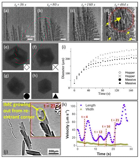 Time-resolved vertical 2D slices from 3D tomographs showing (a–c) development of columnar -Al dendrites and (d) appearance of secondary -AlFeSi IMCs in the inter-dendritic region of an A319 alloy solidifying at 0.1 K s [113]. Time was set when a dendrite first appeared at the bottom of the field of view. (e–h) Radiographs of four primary -Al(Fe, Mn, Cr)Si crystals formed at 0.5 K s [23]. (i) Corresponding size evolution of the four IMCs as a function of time [23]. (j) A radiograph of elongated primary AlFe at 0.5 K s, with a magnified inset image showing a thin IMC plate growing out from the re-entrant corner along the original, preferential growth direction [24]. (k) Corresponding velocity evolution as a function of time [24].