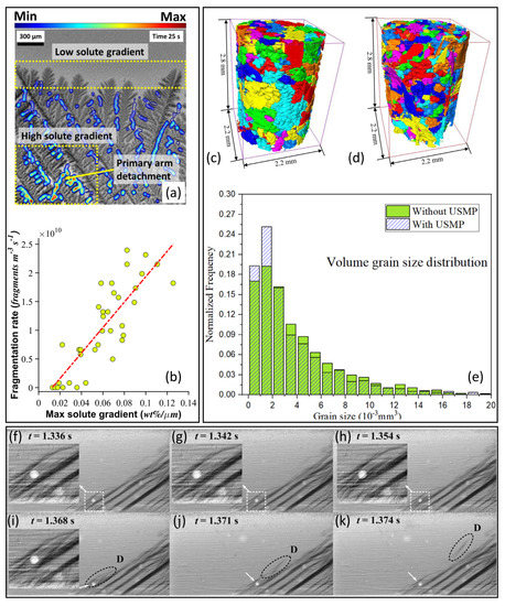 (a) Horizontal solute gradient contour map within the inter-dendritic channels of a solidifying Al-25wt%Cu alloy at 1 K s [29]. (b) The local dendrite fragmentation rate as a function of the maximum local inter-dendritic solute gradient in the liquid. The red dashed line represents a linear best fit [29]. Rendered tomographs of an Al-15wt%Cu alloy towards the end of solidification (c) without and (d) with USMP [32]. (e) The corresponding -Al grain size distribution [32]. (f–k) A radiograph sequence showing the fragmentation of a primary AlCu IMC (with the fragment “D” highlighted by a dashed ellipse) [30].