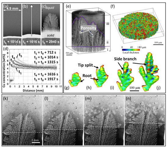 Buffet et al. and then Bogno et al. investigated solute segregation in front of a planar solid/liquid interface and the resulting instability, during early-stage directional solidification of an Al-4wt%Cu alloy (Figure 7a–c) [33,34]. Figure 7a,b shows radiographs of a planar -Al solidification front propagating upwards, anti-parallel to the imposed thermal gradient. As explained in Section 3.1, Cu was rejected by the growing -Al at the solid/liquid interface, enriching the local liquid and gradually diffusing down the concentration gradient with distance from the interface towards the bulk alloy composition (Figure 7d). This local Cu enrichment destabilised the growing planar interface and caused it to break down and transition to a dendritic microtructure (Figure 7c).