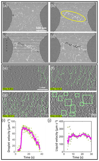 (a–d) Longitudinal section of a tomograph sequence showing the microstructure of semi-solid Al-8wt%Cu under uniaxial tension [128]. (e–g) A radiograph sequence of emulsified Pb droplets moving down the inter-dendritic liquid channels between pre-developed equiaxed -Al dendrites, following paths indicated by the green arrows. Time s was set when an -Al dendrite started to form in the field of view. (h) A radiograph showing hot tears (indicated by green boxes) formed towards the end of solidification. (i) The mean Pb droplet velocity as a function of time. (j) The estimated velocity of the liquid flow as a function of time.