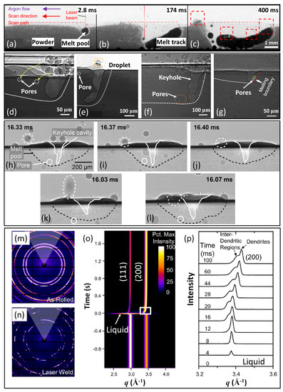 (a–c) A radiograph sequence showing the evolution of the melt track morphology at the onset, intermediate and final stages of LPBF, respectively [50]. (d) A radiograph showing the transfer of pores from the powder bed into the melt pool [147]. (e) Pore formation due to surface fluctuation of the melt pool [147]. (f) Pore formation due to collapse of the keyhole [147]. (g) Pore formation along the melting boundary [147]. Radiograph sequences showing the interaction between powder particles and the melt pool during DED process for (h–j) a particle with a lower velocity estimated at ∼1/ and (k,l) a particle with a higher velocity estimated at ∼10/ [54]. Debye–Scherrer rings of a Mn-Fe-Co-Ni-Cu high-entropy alloy (m) in a cold-rolled state and (n) after laser welding [68]. (o) Time-resolved 1D diffraction pattern as a function of the reciprocal lattice vector q. Time indicates the onset of solidification [68]. (p) Evolution of the (200) peak at a selected time interval (indicated by a box in (o)) [68].
