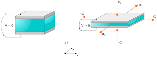 The superposition approach can be used to show that it is possible to regard the different stress states as equivalent. The fact that a hydrostatic pressure could be chosen arbitrarily to result in the same deformation state makes that approach less intuitive. Any other vector for p would be still correct as long as it consists of same values for its components but it would deliver another expression out of the superposition. A more intuitive approach is to underpin the outcome of equivalent stress states by taking the stress-induced deformation of the dielectric material into account. To describe the deformation, Hooke’s law for linear elasticity in isotropic materials is suitable. It describes the component-wise spatial strains resulting out of a given stress state and the material’s Young’s modulus . Note, that a load on a material in one direction always causes stress in only that direction but strains in all free directions. Under the assumption of a Poisson ratio of = 0.5, Hooke’s law can be expressed as: