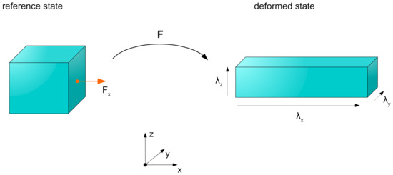 Under the mentioned assumptions from Section 2, the actuator geometry can be modeled as an incompressible rectangular cuboid. The dielectric material inside the DEA consists of an elastomer such as silicone that shows a liquid-like behavior in a way that it can be regarded as fully elastic and incompressible. The resulting deformation out of the electrical activation can be described using a deformation gradient tensor that consists of the spatial stretch ratios as following.