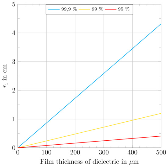 Using that outcome, corresponding value combinations of film thicknesses and inner radii can be calculated to mark the limits for the results from the correct approach from Equation (74) to be within the defined deviation of the approach from Equation (33). By assigning discrete values for d, the corresponding inner radii can be calculated as