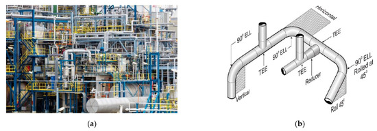 Piping systems within refinery companies enable the continuous transfer of raw materials for the purposes of the assumed technological process of crude oil processing. Therefore, the condition of these systems directly impacts the safe operation of the company and ensures the required efficiency of the technological process. The piping systems of refineries include, among others, linear pipe sections, various types of pipe fittings, devices for forcing the circulation of the raw material (pumps), elements controlling its flow direction (valves), heat exchange systems, and systems for collecting the product. Welded joints are also considered the main parts of piping systems and as elements that are critical to the safe operation of refineries (Figure 1) [1,2,3,4,5,6,7,8,9,10]. The initial stage of the piping system design process is to define the functional requirements for the geometric form of its route. Meeting these assumptions will enable obtaining a safe transport route of the raw material from the starting point to the endpoint. On the other hand, its final form is influenced by such factors as the type of the transported raw material, the speed and the flow rate, the working pressure, the ambient temperature and the temperature of the transported fluid, results of the selection of design features based on strength analyses [4,5,6].