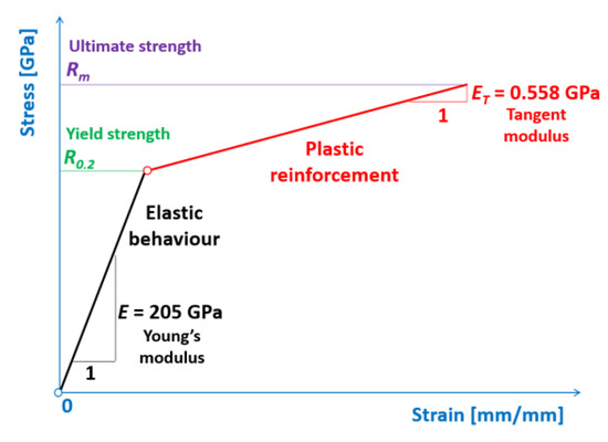 The bilinear elastic-plastic material model of a welded joint of API 5L X80 steel pipes was adopted for performing the numerical simulations, as presented in Figure 2.