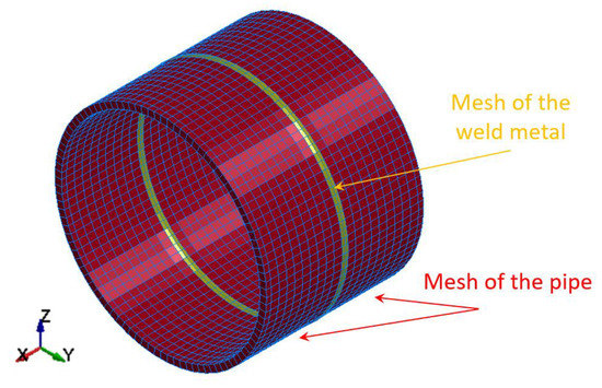 The physical model of the MMA, GMA, SSA, LASER+GMA butt welded joints of sections of 120 mm width of API 5L X80 steel pipes, dia. 323.9 mm and wall thickness 10.0 mm, impact loaded in the die forging hammer apparatus is shown in Figure 3. The mean thickness of the welded joints reinforcement is 12.0 mm, and the mean width of the weld metal is 9.0 mm (the width of the weld face is approximately 16.0 mm, and the width of the weld root face is approximately 2.0 mm). Because the welded joints’ HAZ (Heat Affected Zone) is very narrow, it was assumed to treat the HAZ as part of the weld metal. The butt welded joints of the pipes specimen have been divided into shell finite elements with five degrees of freedom in a node. Five Gauss integration points on the thickness of the shell of the butt welded joints of pipes were assumed. The weld metals and the pipes were mutually connected using the same nodes (without introduced contact) because they formed one inseparable entity.