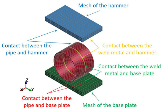 Contact details between modeled welded joint of pipes, the hammer, and the base plate.