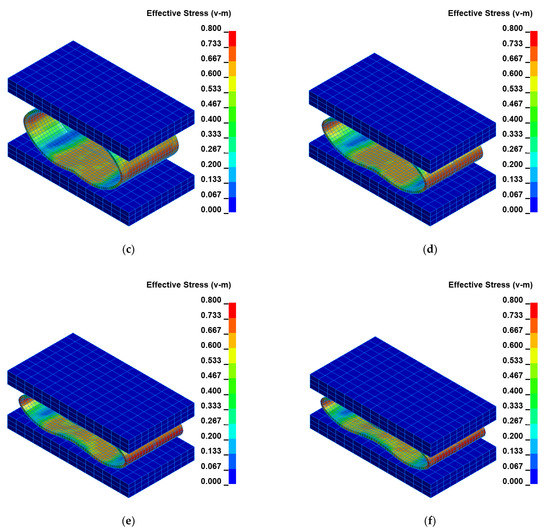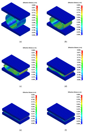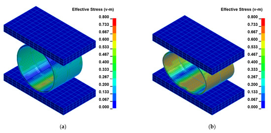 The impact loading process of the welded joint of API 5L X80 steel pipes was modeled using the finite element method–FEM and computer system LS-DYNA. The numerical calculations results were juxtaposed for several successive time intervals to facilitate the investigation of the mechanism of the process using the impact loading hammer and the base plate of the die forging hammer apparatus. Two optimal variants were researched for two different heights: H = 1.0 m and H = 1.5 m, respectively, as shown in Figure 6 and Figure 7.