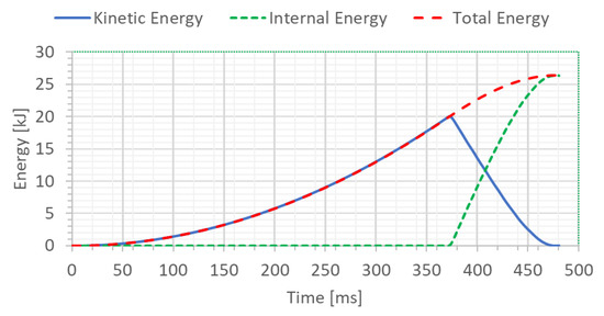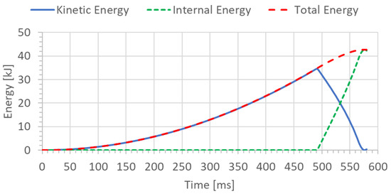 To check the correctness of numerical calculations, the energy balance of the welded joint of pipes (specimen) was determined for two analyzed cases, H = 1.0 m and H = 1.5 m, respectively (Figure 8 and Figure 9). The initial potential energy could be compared with the total energy for the final time instant.