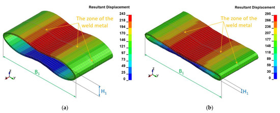 The resultant displacements [mm] in the welded joint of pipes for two variants: (a) height H = 1.0 m (H1 = 64 mm; B1 = 461 mm), (b) height H = 1.5 m (H1 = 20 mm; B1 = 481 mm).