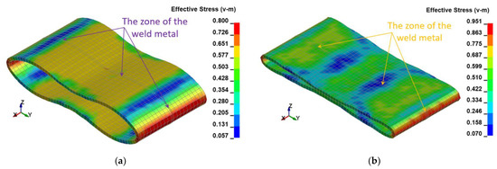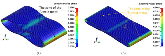 The Huber–Mises effective plastic strains [mm/mm] in the welded joint of pipes for two variants: (a) height H = 1.0 m, (b) height H = 1.5 m.