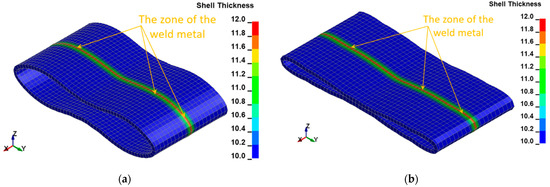 The following resultant values of several selected physical quantities such as displacements (Figure 10), Huber–Mises stresses (Figure 11), effective plastic strains (Figure 12), as well as thickness of the welded pipe (Figure 13) for the final position of the deformed welded joint of pipes are juxtaposed consecutively for two considered variants of height H = 1.0 m and H = 1.5 m, respectively. These data are intended to initially estimate the parameters of the actual experiment.