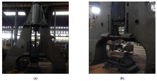 The developed impact loading technique to test the resilience to catastrophic impact loading of the MMA, GMA, SSA, and LASER+GMA butt welded joints of API 5L X80 steel pipes was executed at KUZNIA ŁABĘDY S.A. plant (www.kuznia-labendy.pl, accessed on 25 November 2021) on the die forging hammer SKM-3T apparatus (Figure 14), at the load of the 3000 kg weight (mass) of the freely dropping hammer and two hammer heights 1.0 and 1.5 m, selected on the bases of the results of analysis of FEM modeling of impact loading of welded joint of pipes, Table 5 and Table 6, Figure 6, Figure 7, Figure 8, Figure 9, Figure 10, Figure 11 and Figure 12. The scheme of impact loading tests of butt welded joints of API 5L X80 steel pipes is shown in Figure 15. The first impact loading test was done for the MMA butt welded joint specimen at the hammer load of 3000 kg from the height of 1.0 m. The impact loaded specimens were flattened to the geometrical dimensions H and B [mm], and no cracks in extreme stressed/strained areas of the butt welded joint or pipes edges were detected, despite the level of FEM calculated Huber–Mises stresses were over tensile strength of the weld metal and the API 5L X80 steel (Figure 16).