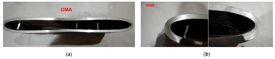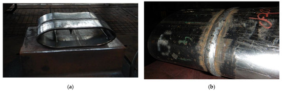 A view of MMA butt welded joint of API 5L X80 steel pipes after the 3000 kg impact loading test–the hammer height 1.0 m. No cracks of both extreme stressed/strained areas of the MMA butt welded joint (a,b).
