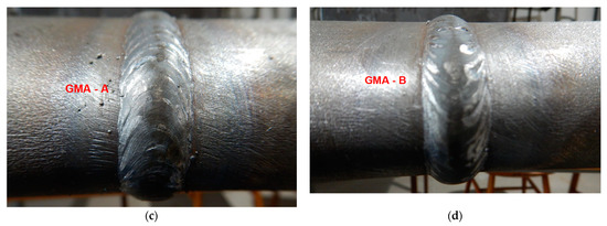 A view of GMA butt welded joint of API 5L X80 steel pipes and pipes edges after the 3000 kg impact loading test (the hammer height 1.0 m). No cracks of both extreme stressed/strained areas of the butt welded joint (c,d), and no cracks and tears of the extreme stressed/strained areas of the edges of the pipes (a,b).