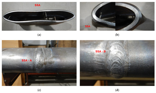 A view of cracked both extreme stressed/strained areas of MM2-A–(c) and MM2-B (d), of welded joint of API 5L X80 steel pipes specimen and pipes edges after the 3000 kg impact loading test (the hammer height 1.5 m). No cracks or tears of the extreme stressed/strained areas of the edges of the pipes–(a,b).