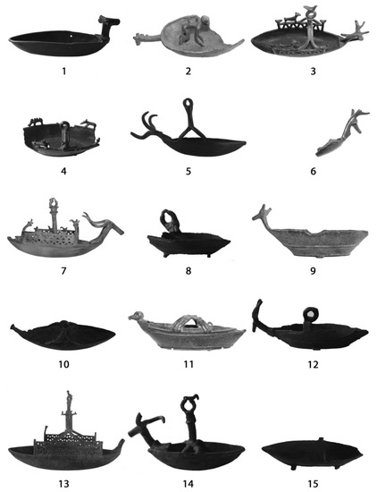 - Depalmas, A. Le Navicelle di Bronzo Della Sardegna Nuragica; Ettore Gasperini—Società Poligrafica Sarda: Cagliari, Italy, 2005. [Google Scholar]