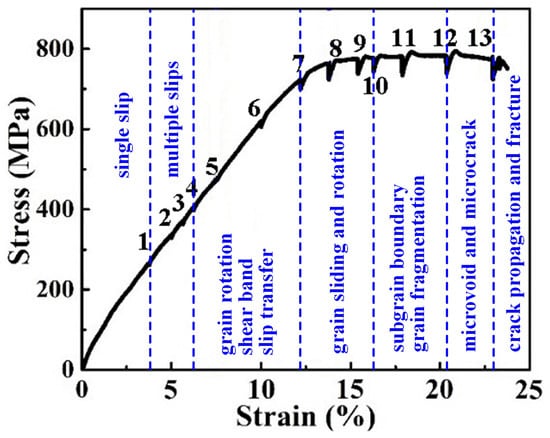 Figure 8 reveals some deformation characteristics in the microstructure of the Ti-54432 alloy in the in-situ tensile test. It can be seen that there are fewer dislocations in the equiaxed αp grains and βt matrix of undeformed alloy, and the diffraction patterns prove the existence of α and β phases. After tensile deformation, the equiaxed αp grains are obviously elongated in the tensile direction, and there are many dislocations at the grain boundaries. Although the βt matrix has more slip systems, the hindering effect of αs phases on dislocation slip leads to the formation of many dislocation tangles in the βt matrix. When the slip transfer between the αp grains and βt matrix is insufficient, the shear bands are generated in the severely deformed αp grain, resulting in the fragmentation of αp grains into smaller grains [26,27]. It can be inferred that although there are more potential slip systems in the β phase than in the α phase, the αp grains are relatively softer and more prone to the dislocation slip because the precipitation of the αs phase in the βt matrix increases the strength of the βt matrix and inhibits the dislocation slip [10,28]. The above reasoning can also be confirmed by the fact that the deformation of α accounts for most of the total deformation of the alloy. However, for the two-phase titanium alloy TC21, the β matrix is still relatively soft and deformed first, even if the αs phase precipitates on the β matrix [29]. We believe that the hardness contrast and deformability difference between α and β phases may depend on the degree of precipitation strengthening, that is, the size, quantity and distribution of the αs phase.