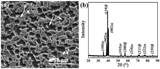 SEM image of microstructures (a) and XRD pattern (b) of the Ti-54432 alloy after solution and aging treatments.