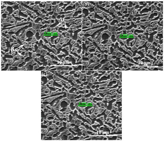 The morphology, crystallographic orientation, and internal activated slip systems of the α and β phases in the equiaxed microstructure affect the crack propagation behavior, and thus determine the fracture mode of the alloy, as shown in the SEM images in Figure 11. A schematic diagram is summarized to visually show the responses of crack to different microstructures during propagation. The crack propagates from the V-notch to the middle of the specimen along the direction at an angle of 45° with the tensile direction, namely the maximum shear stress direction, and then along the direction almost perpendicular to the tensile direction until the specimen fracture. The deflection of the crack propagation direction is determined by the crystallographic orientation of grains along the propagation path and the activated slip systems within the grains [7]. Dislocation accumulation at grain boundaries of equiaxed αp grains promotes the activation of slip systems in the adjacent βt matrix [36]. When there are activated slip systems in both αp and βt phases, the slip transfer may occur between them. We propose that the slip transfer is an important mode of the coordinated deformation of two phases, since the continuous slip lines are observed in the equiaxed αp grains and adjacent βt matrix [37]. At the same time, because the potential path of slip is extended, it may also become the path for transgranular crack propagation. In this case, the crack does not deflect obviously and propagates rapidly when it passes through the equiaxed αp grain and βt matrix. However, even though multiple slip systems are activated in the βt matrix, it is difficult for slip transfer to occur between two adjacent grains if the crystallography orientations of the αp and β grains are severely mismatched. In the propagation process, the crack will turn to the grain with the more suitable crystallographic orientation and activated slip systems. Predictably, once the well matching relationships of the crystallography orientation between the grains in the crack propagation direction are restored, the crack will continue to straight propagate rapidly. Besides the transgranular propagation in the grains, the crack also propagates in the intergranular mode at the interfaces with a large number of microvoids and microcracks, including the αp/αp grain boundary, αp/βt phase interface, and αs/βt phase interface. For the same microvoids coalescence fracture, the crack propagation may be only transgranular in the bimodal microstructure [9], while it is usually a mixture of transgranular and intergranular in the equiaxed microstructure.