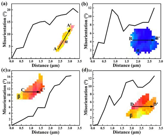 In the process of tensile deformation, the substructure evolution in the grain depends on the cumulative (maximum) misorientation [20,21,22]. The orientation inside the grain is consistent before deformation. Four grains in the deformed Ti-54432 alloy are selected for crystallographic orientation analysis, including two α grains and two β grains, as shown in Figure 5. For the two α grains, their cumulative misorientations, namely the misorientations between two pixels along the arrow direction (A-A’ and B-B’), are 20° and 12°, respectively. This indicates that the α grains rotate along the arrow direction and seriously deform by the dislocation slip, accumulating abundant dislocations within the grains. For the two β grains, the cumulative misorientations (C-C’ and D-D’) are 18° and 12°, respectively, indicating that the β grains also rotate. As a result, the large angular rotation and serious deformation adjust the grains to a crystallographic orientation that is more conducive to the dislocation slip, but also provide the possibility for the nucleation of microvoids at the grain boundary.